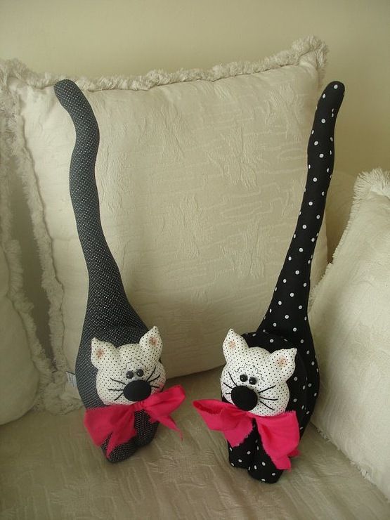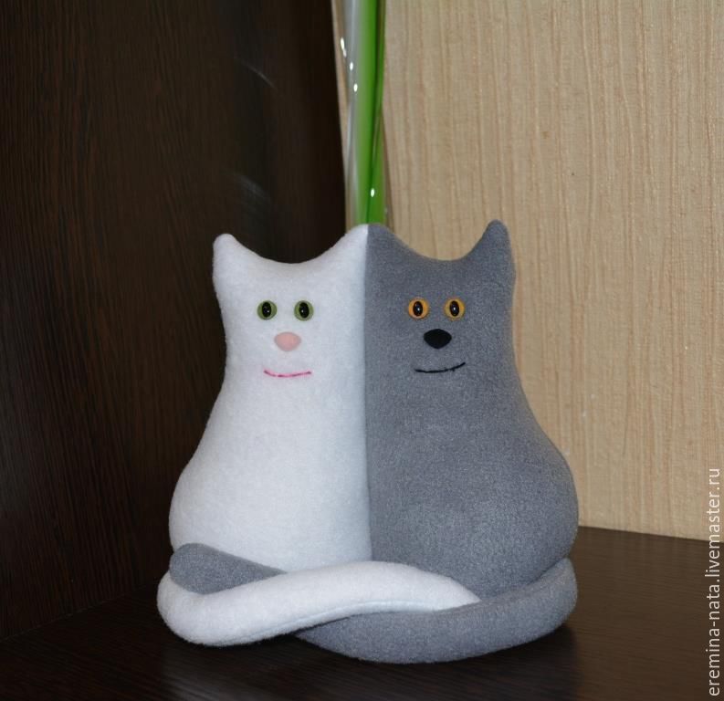 Как вариант, можно сшить парочку: кота и кошку — которые могут самостоятельно стоять. При этом их можно смастерить в сувенирном варианте, сделать достаточно большими и также использовать в качестве подушек. Приятным подарком на День святого Валентина станет кот из ткани. Выкройки несложные, главное — запастись терпением.