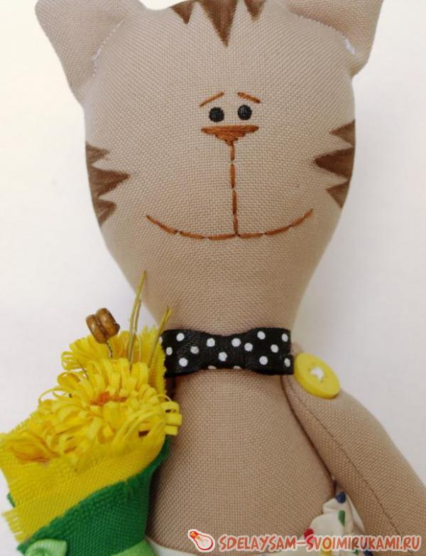 Сделайте цветочки из яркой ткани и пришейте по всему телу кота. Повяжите нить, на которой нанизан бисер — это будет ожерелье. Букет делается из бумажных миниатюрных цветков.