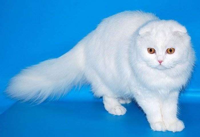 Скоттиш-фолды внешне очень схожи с британцами. Белый окрас, запредельно голубизны глаза и гетерохимия так же свойственны шотландцам, как и их британским собратьям. Однако, их отличительная черта – вислоухость, отсутствует у представителей британских пород. Кошки данной породы могут похвастаться шикарной плюшевой шубкой с густым мягким подшерстком. Это типичные лежебоки, обожающие понежиться в тепле и комфорте. В то же время им присуща не дюжая самостоятельность. Эти мурлыки ладят с детьми и домашними животными, никогда не откажутся поиграть, но, в основном, ведут себя независимо.