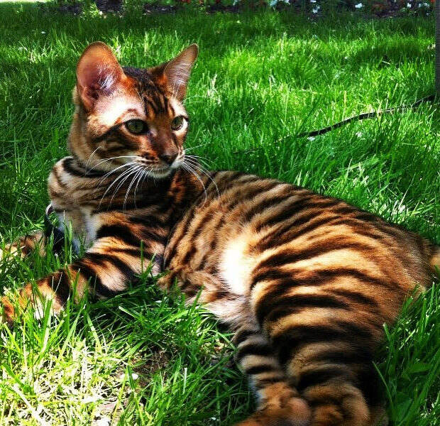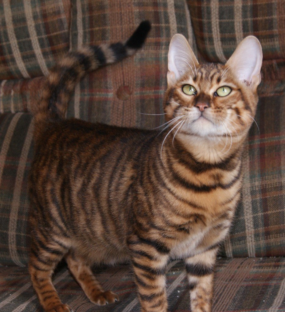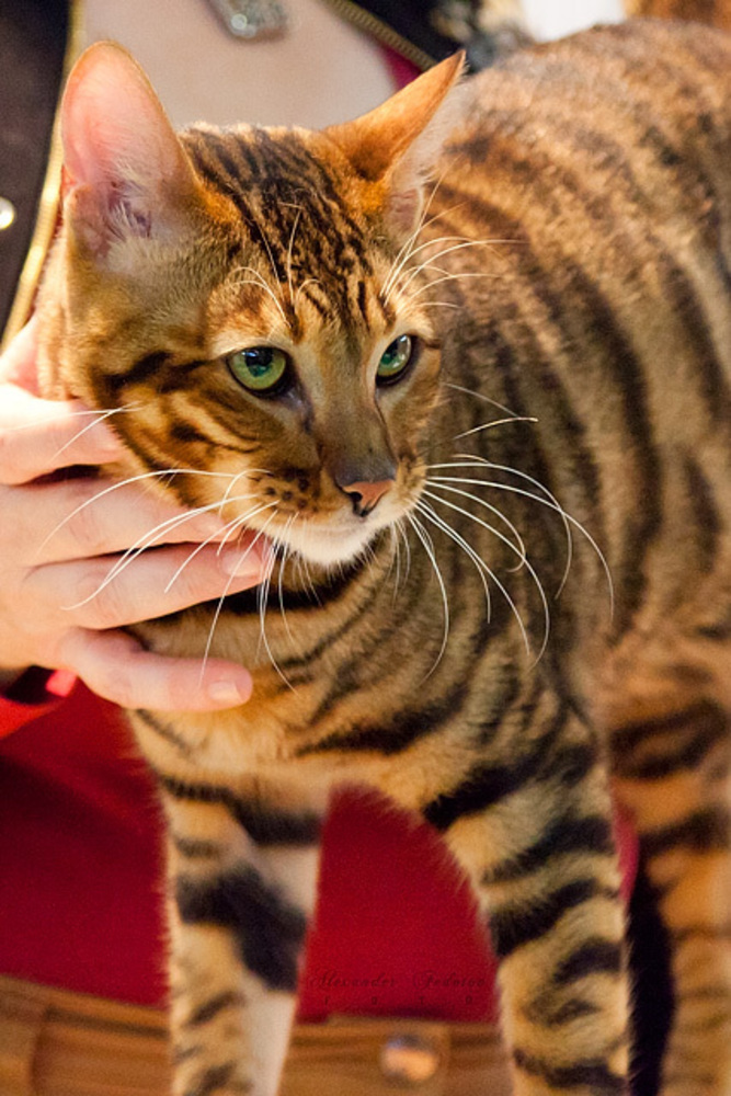 Окрас: максимально контрастная тигровая расцветка, в которой тебби-отметины могут иметь палитру от черного до рыжевато-коричневого. Но, в отличие от них, эти кисы имеют покладистый характер, подобно ориентальным и тайским кошкам обожают играть с детьми и очень преданы своему хозяину.