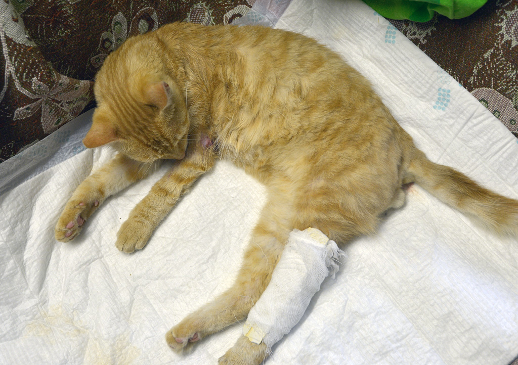 На сегодняшний день кот чувствует себя хорошо, он практически здоров, нормально, без хромоты опирается на лапу. Через 30 дней, после мини операции по извлечению спиц он будет полностью здоров.