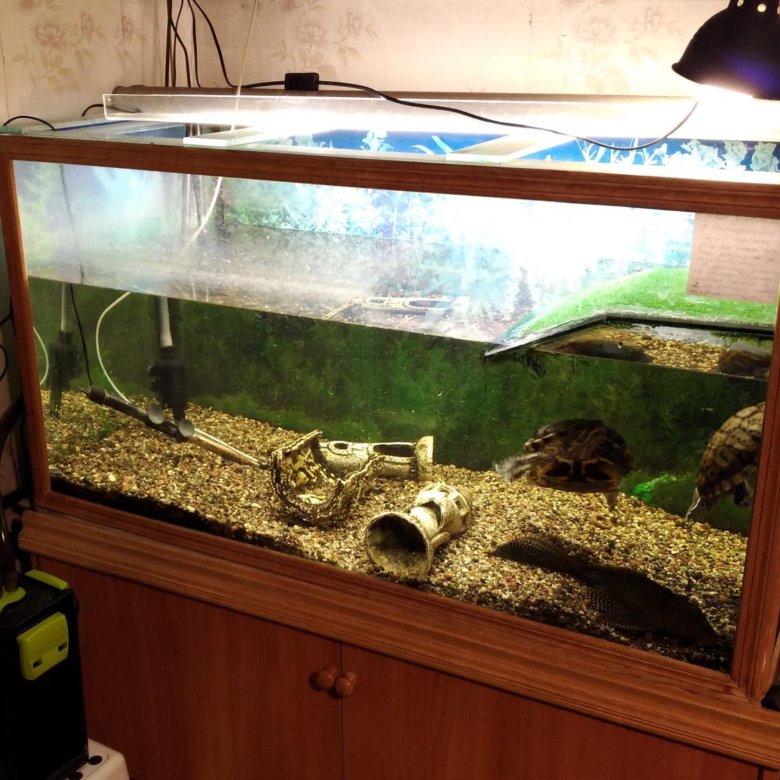 Большинство черепах могут быть удобно размещены в аквариуме на 25 или 50 галлонов. Аквариум с черепахой должен содержать не только сушу, но и воду. (Имейте в виду, что черепахи — наземные существа, которых нельзя держать в аквариуме с черепахами.Уложите субстрат наклонно или насыпьте камни так, чтобы черепаха могла стоять на твердой земле, тело полностью погружено в воду, а голова находится над поверхностью. Глубина воды должна быть больше, чем длина вашей черепахи, а это означает, что вам, возможно, придется регулировать глубину воды по мере роста черепахи. По сравнению с рыбами черепахам требуется много яркого света, поэтому аквариум с черепахами должен быть оборудован люминесцентным светом. Черепахи хладнокровны и нуждаются в хорошем обогревателе в аквариуме для черепах, чтобы оставаться в тепле.
