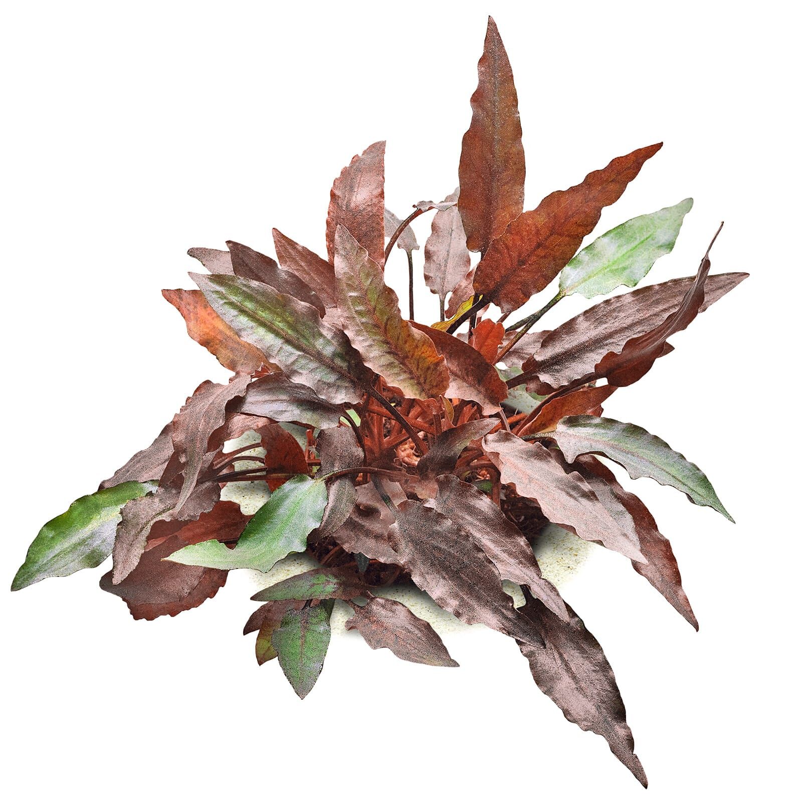 Розеточное растение, образует крепкую корневую систему вскоре после помещения в грунт. Листья нежные красновато-коричневого или темно-оливково-бурого цвета с фиолетовой нижней стороной, со слегка рифлеными краями, но во многом цвет и форма листьев будут зависеть от условий содержания (освещения, подачи СО2, количества питательных веществ). Рост средний, 10-15 см в высоту, растет медленно; ширина розетки 8-15 см.