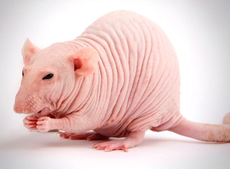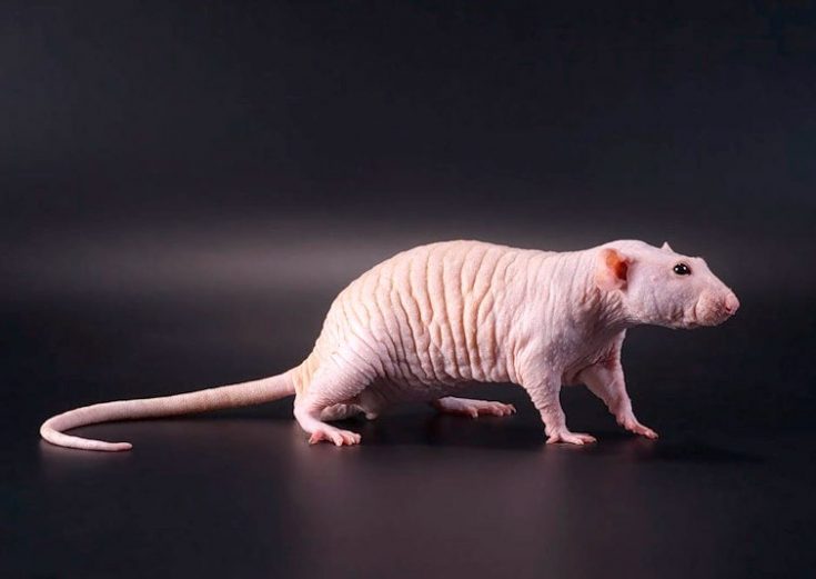 Это достаточно интересная порода декоративных грызунов, которая не имеет волосяного покрова (шерсти). На теле голого животного можно изредка найти волос, торчащий в районе брюшной полости, на голове или на конечностях. У некоторых представителей этой разновидности домашних крыс имеются усы. Кожа у зверька розоватая и слегка морщинистая. Крыса «Сфинкс» хотя и пользуется популярностью, но у немногих любителей домашних животных.
