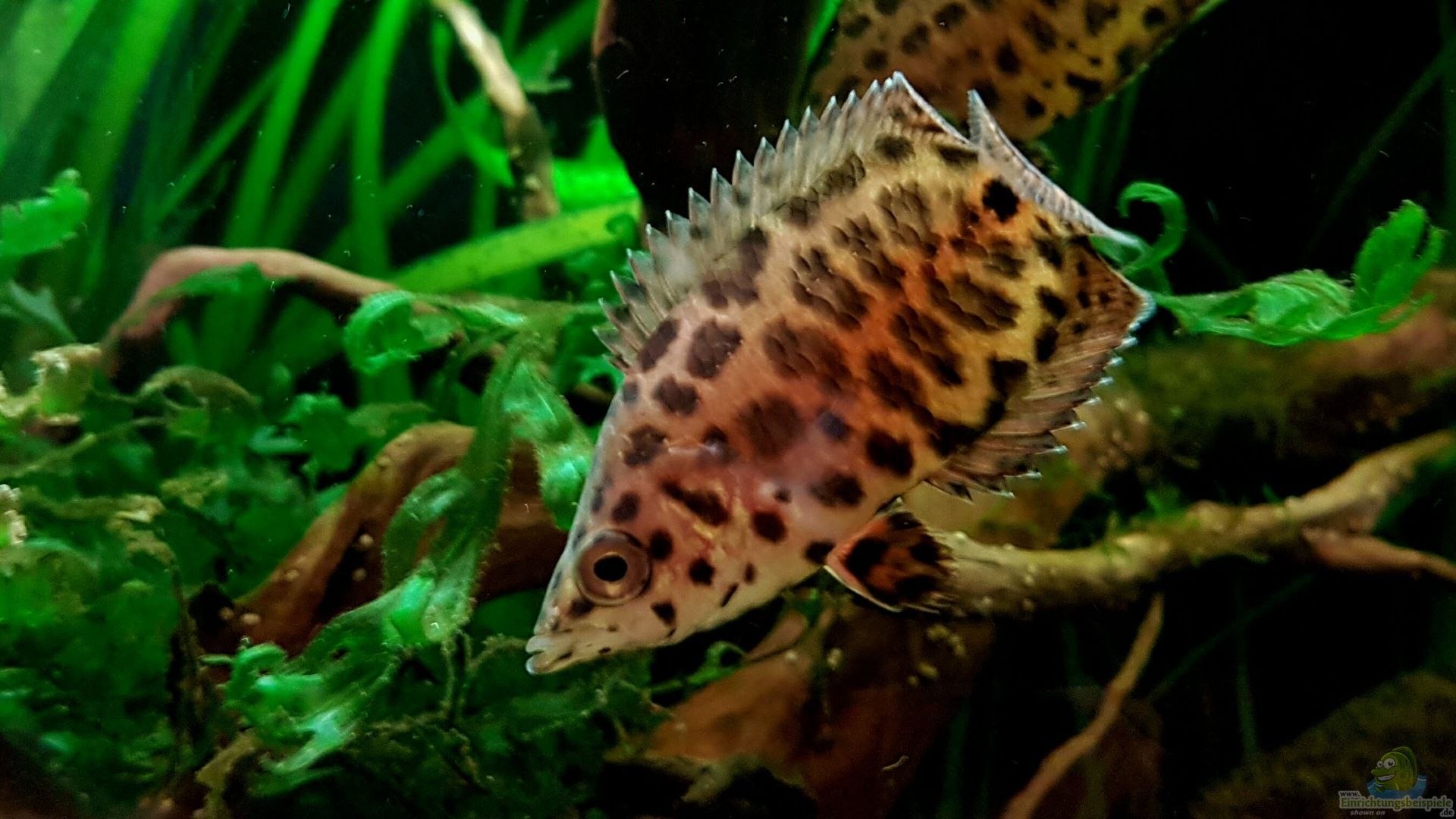 Рыба имеет узорчатую окраску – по желто-коричневому телу и плавникам разбросаны темные пятна. Такая окраска очень похожа на леопардовую и полностью скрывает очертания тела. На хвостовом стебле вертикальная полоса яркого цвета.