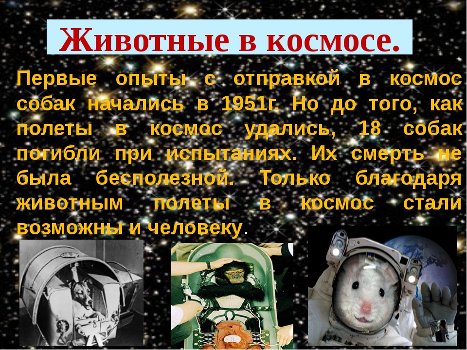 Сегодня, когда космос постепенно становится местом не героических свершений, а обычной повседневной работы, во время почти каждого полета проводятся медико-биологические исследования на различных живых организмах. Так что история космонавтики была бы недостаточно полной без упоминания «животных-космонавтов».