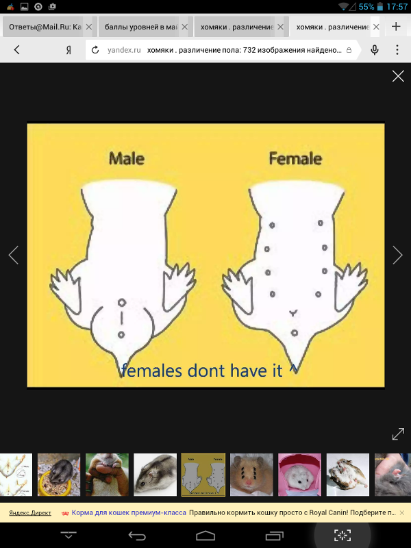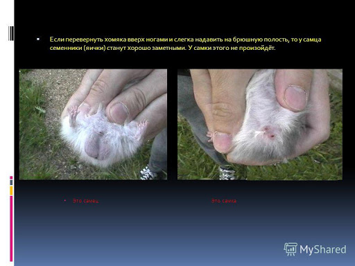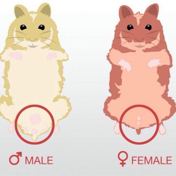 Совет седьмой. Для того чтобы купить того хомячка, который Вам на самом деле нужен, запомните следующие их половые признаки. Два отверстия внизу животика у самки расположены ближе друг к другу, чем у самца. Низ живота у самцов более вытянутый, и, как правило, они спокойнее самок.
