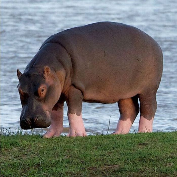 Выглядит гиппопотам массивно не только из-за своих размеров и веса, но и из-за того, что имеет короткие ноги – его живот едва ли не волочится по земле.