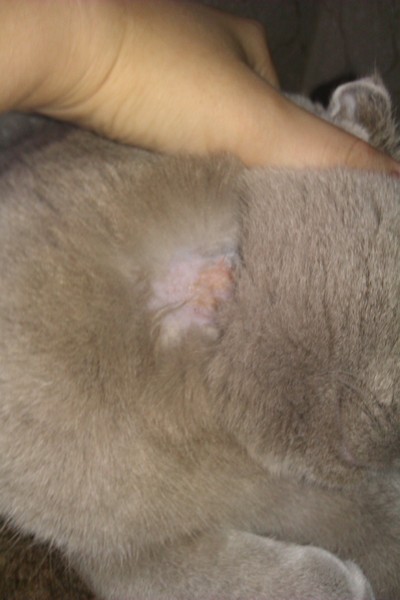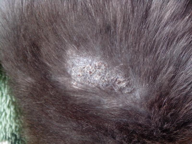 У кошек лишай может проявляться без видимой потери шерсти, но с наличием папулезной сыпи по телу (милиарный дерматит) или в виде акне.