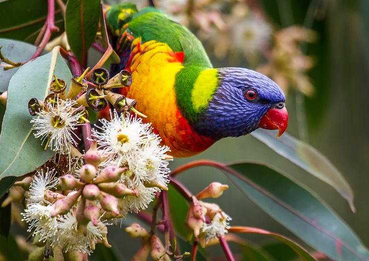 Нектар, семена, цветы, плоды и ягоды – основное меню радужных попугайчиков.