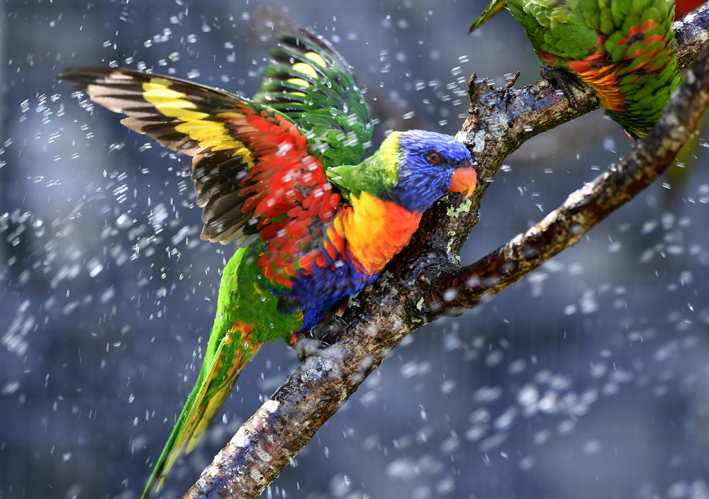 Пара радужных (многоцветных) лорикетовРадужный лорикет очень любит купаться, он может участвовать в водных процедурах по несколько раз в день.