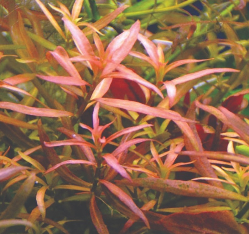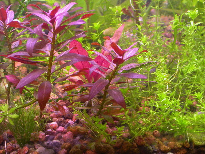 Людвигия гибрид (Ludwigia repens х arcuata).Это длинностебельное растение с глянцевыми овальными листьями, темно-зелеными сверху и красновато-лиловыми снизу. Стебли достигают в длину 30 – 40 см. Растение можно содержать в аквариуме любого объема, но с относительно невысоким уровнем воды, размещая его у боковых стенок и на среднем плане. Равномерный рост наблюдается в течение всего года.
