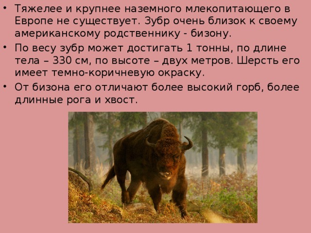 Зубры прекрасные статные млекопитающие, которых мы когда – то могли потерять. В данный момент, из-за плохой окружающей среды и браконьерства, зубров занесли в Красную книгу.