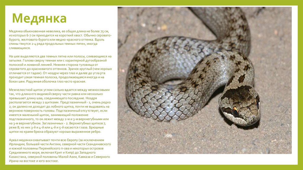 В остальном ядовитая рептилия похожа на медянку, в том числе и размером.