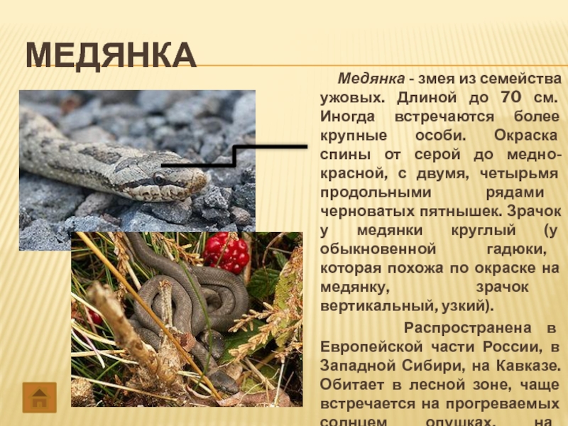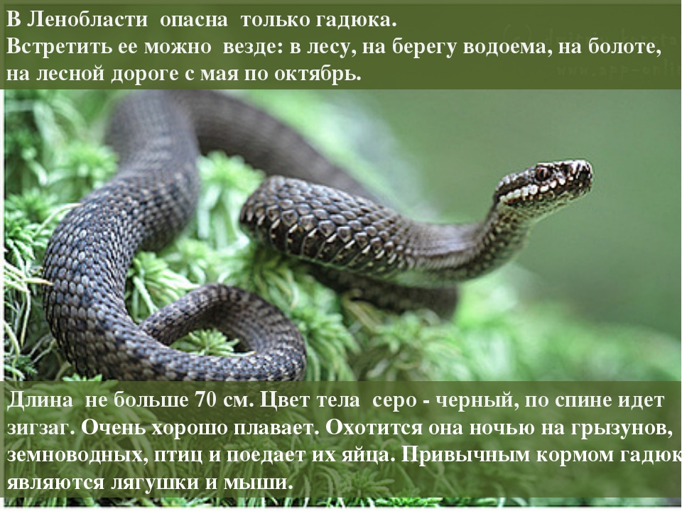 Гадюки — края болот и вырубленные участки леса, уж и медянка — участки около рек и озер.