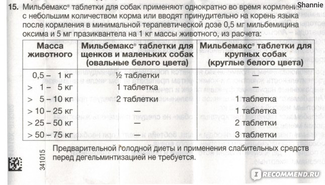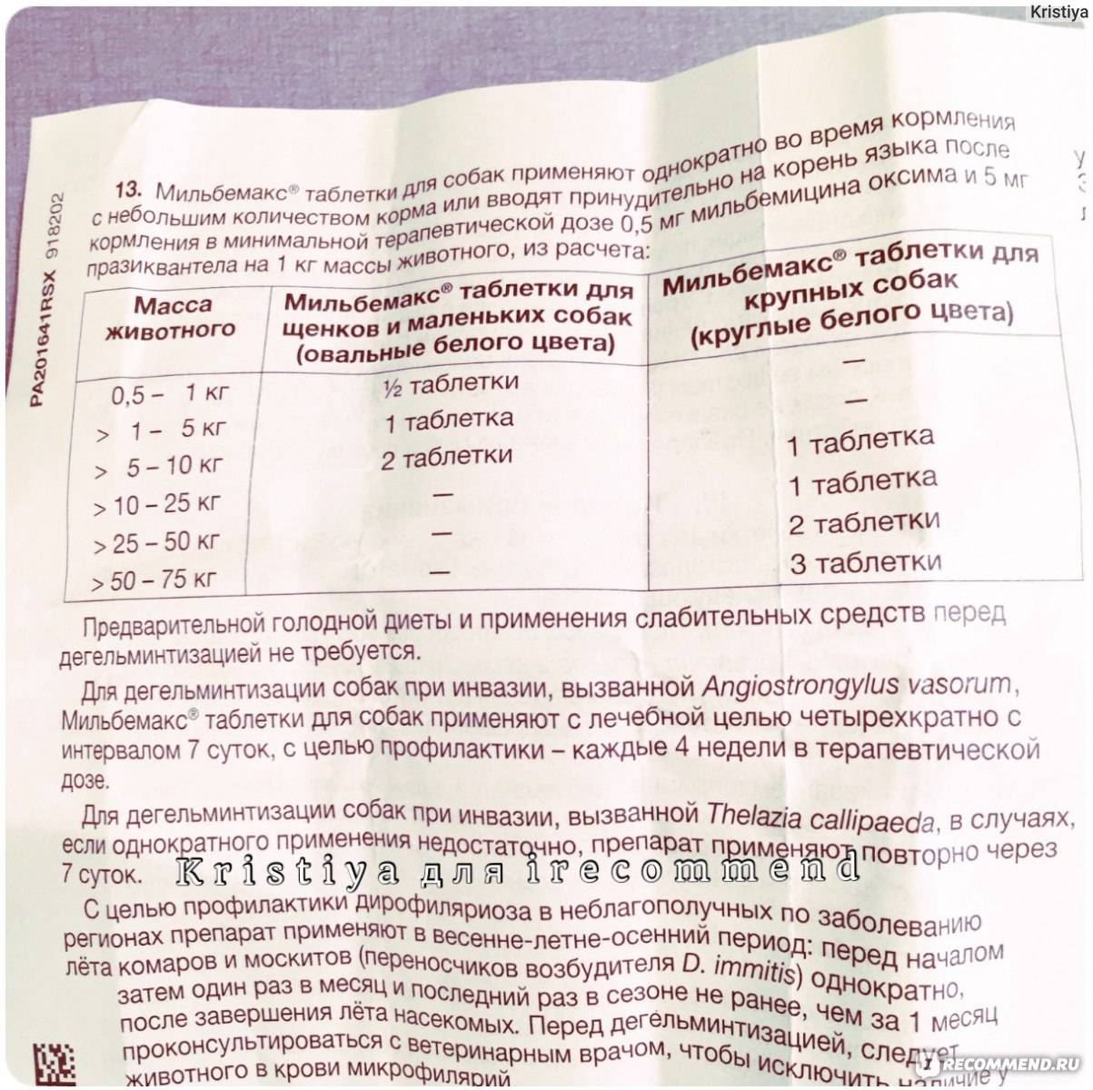 Так, щенкам весом от 0,5 до 1 кг дают половину щенячьей таблетки, малышам весом от 1 до 5 кг – одну таблетку, а от 5 до 10 кг – 2 таблетки. Взрослым собакам весом от 5 до 25 кг дают одну таблетку. Крупным собакам (25-50 кг) положены две таблетки, а гигантам (50-75 кг) – три таблетки. Перед дегельминтизацией с помощью данного препарата применения слабительных средств и предварительной голодной диеты не требуется.