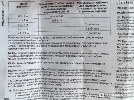 Дозировка мильбемакса в соответствии с весом кошки