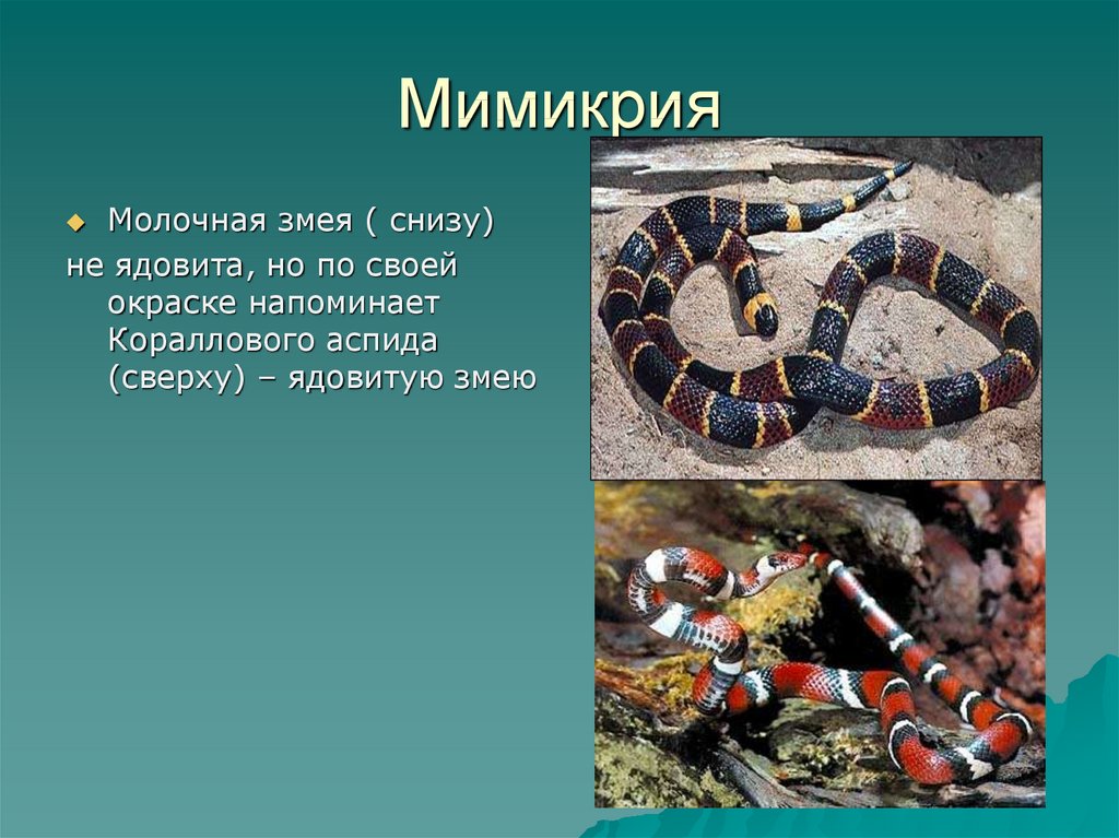 Интересно, но существует целый ряд неядовитых пресмыкающихся, имитирующих окраску своих ядовитых сородичей. К таким, прежде всего, относятся молочная и поперечнополосатая королевская змея.