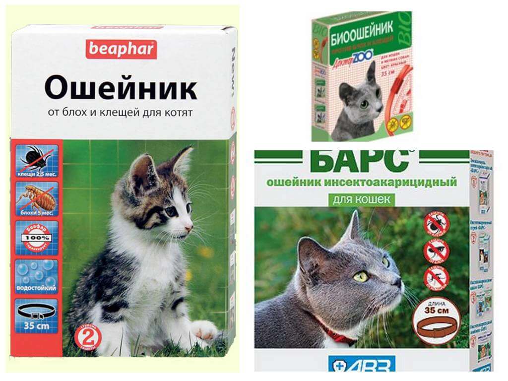 БАРС®. Ошейник для кошек «БАРС®» представляет собой полимерную ленту длиной 35 см. В состав входят фипронил и дифлубензурон, которые обладают активностью в отношении блох, власоедов, вшей, иксодовых клещей. Вещества постепенно выделяются с ошейника и переносятся на кожно-волосяной покров кошки. Ошейник «БАРС®» может применяться у животных с 2-месячного возраста. Нельзя надевать ошейник от блох беременным (в последнюю треть срока) и кормящим самкам, больным и ослабленным животным, котятам до 2-месячного возраста. Изделие обеспечивает эффективную защиту на срок до 4 месяцев.