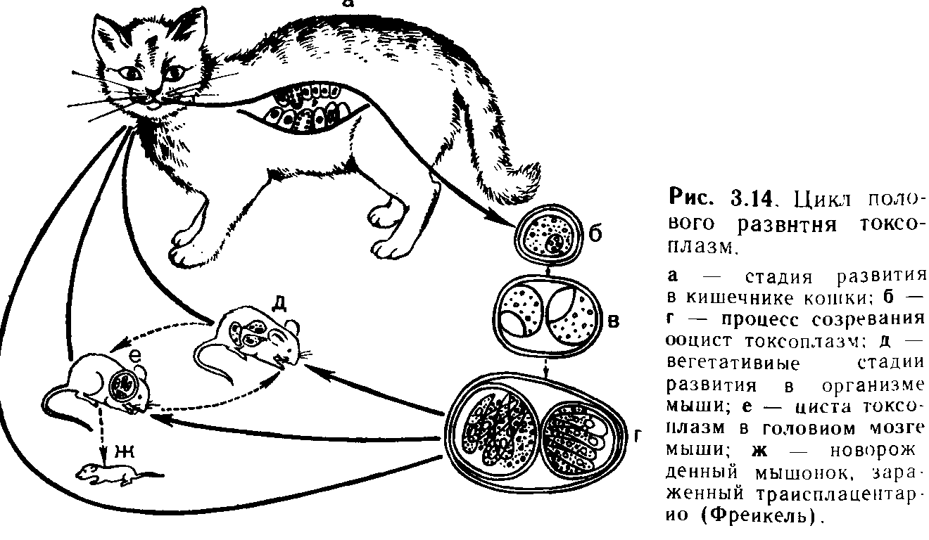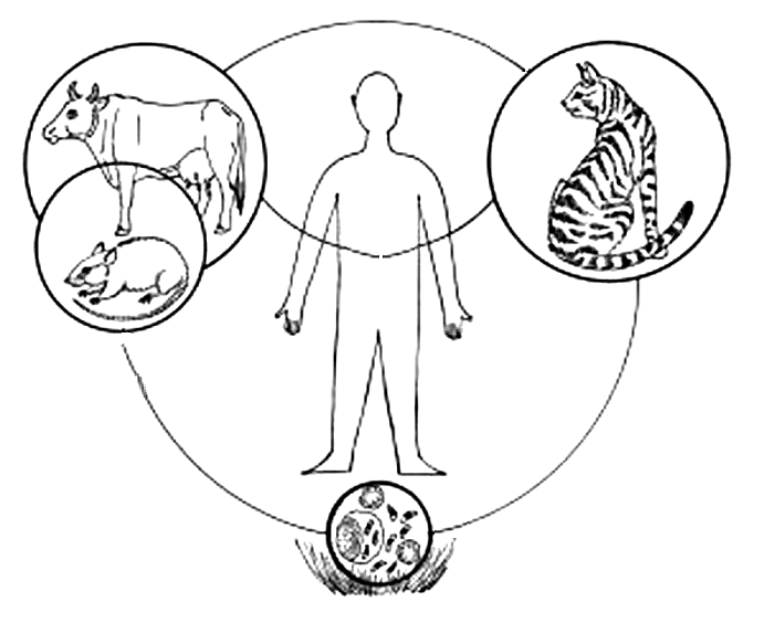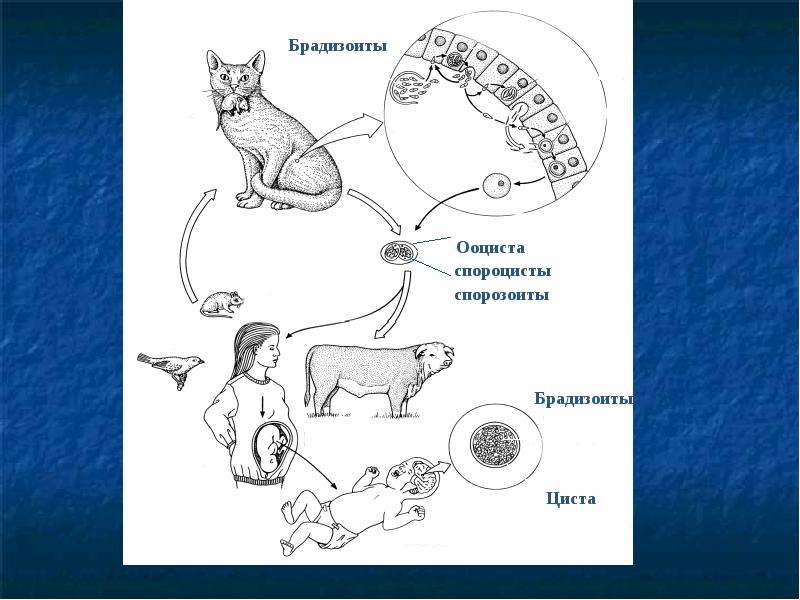 Токсоплазмоз — это зооноз, который встречается во всем мире и вызывается спорозоидом Toxoplasma gondii. Все теплокровные животные могут заразиться Toxoplasma (T.) gondii. Бесполое размножение T. gondii может происходить в самых разнообразных тканях теплокровных промежуточных хозяев.Единственными конечными хозяевами являются кошки или другие представители семейства кошачьих, в кишечнике которых происходит половое размножение. Это приводит к образованию ооцист, которые выделяются в окружающую среду с фекалиями кошки.