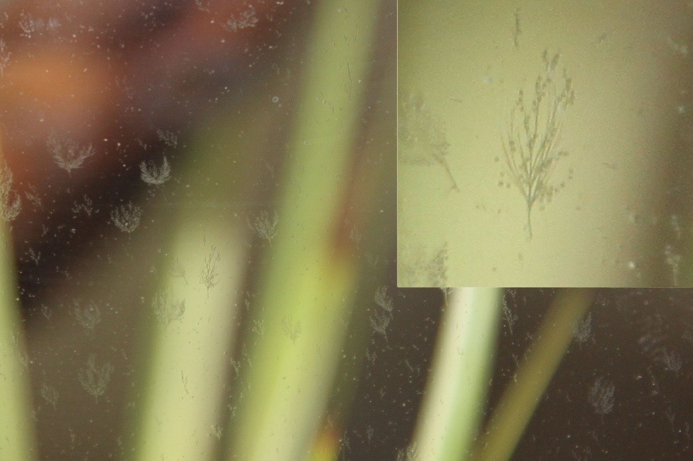 Образует нити из серых или голубоватых роговидных ветвей. Обычно он появляется на краях листьев в виде ворсинок. Любит участки ближе к поверхности. Он сильно прилипает, а поверхность очень жирная, поэтому его практически невозможно удалить. Высокий уровень аммиака, низкий поток и проблемы с балансом питательных веществ будут способствовать появлению этих водорослей.