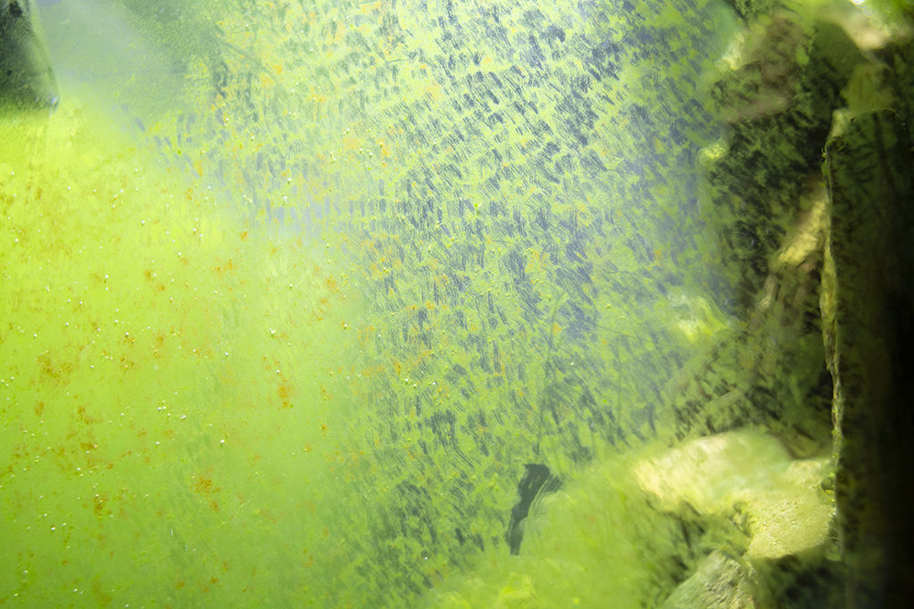 Если в аквариуме появляется большое количество свободных фосфатов или нитратов, то возникает вспышка зеленых водорослей, аквариум мутнеет и появляется зеленый налет.