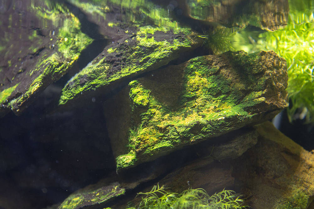 Зеленый налет с камней, декораций и стекол убирают механически, используя губку или скребок.