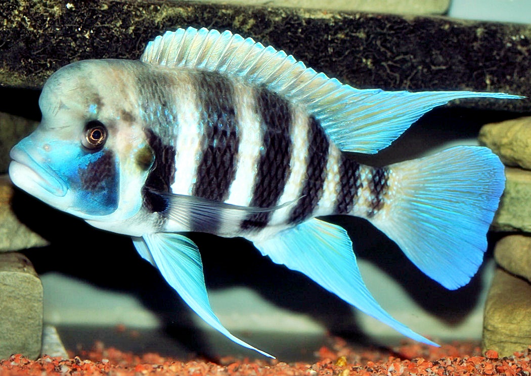 Голубой дельфинГолубой дельфин обитает на африканском континенте и является одной из самых крупных цихлид озера Малави. Свое название рыбка получила за необычайное сходство взрослых самцов с известными морскими млекопитающими.