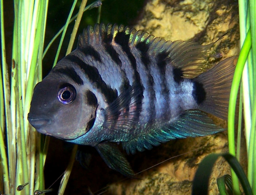 Цихлазома чернополосаяЧернополосые цихлазомы не могут похвастаться яркой окраской или какой-либо выдающейся особенностью. Это достаточно «стандартная» цихлида с сероватым телом и поперечными темными полосками. Однако популярность этой рыбки совершенно от этого не страдает. Наиболее вероятно это обусловлено высокой выносливостью цихлазомы, ее небольшим размером (порядка 10 см) и легкостью размножения. Да и агрессивность чернополосолой цихлазомы не такая уж выраженная, особенно если содержатся рыбки в просторном аквариуме.