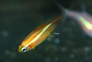 Неон золотой (Paracheirodon innesi var.) – наименьший из неонов. Он вырастает всего лишь до 1,5 см. По телу рыбки идет полоска золотого цвета.