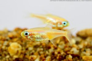 Это самый маленький неончик из всех представителей. Его максимальный размер достигает в длину лишь 1,5 сантиметра. Украшен золотой полосой, которая тянется по всему тельцу.