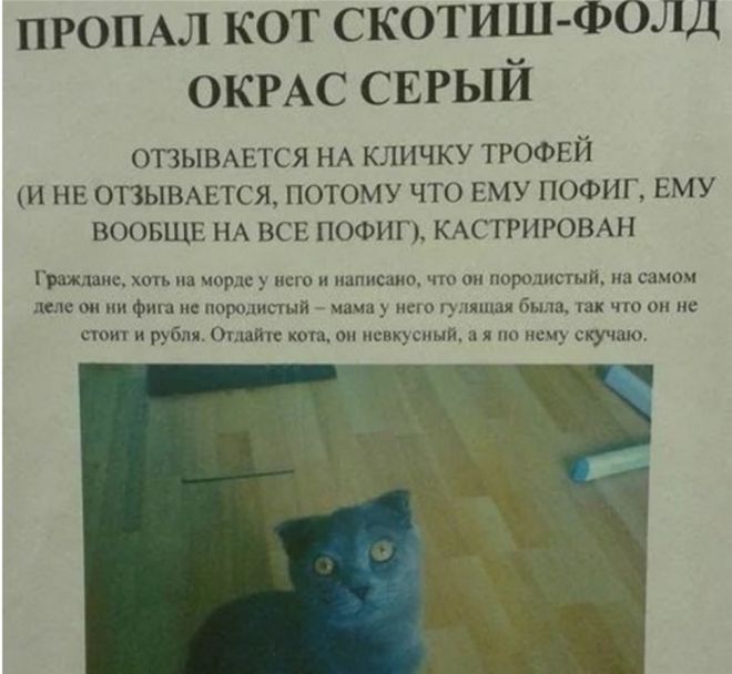 Как написать объявление о пропаже кота, добавив эмоциональности? Поиски любимца – серьезный стресс для всех членов семьи, и не всегда получается добавить в текст немного юмора.