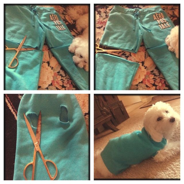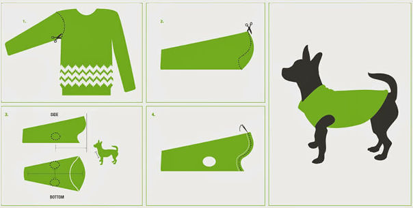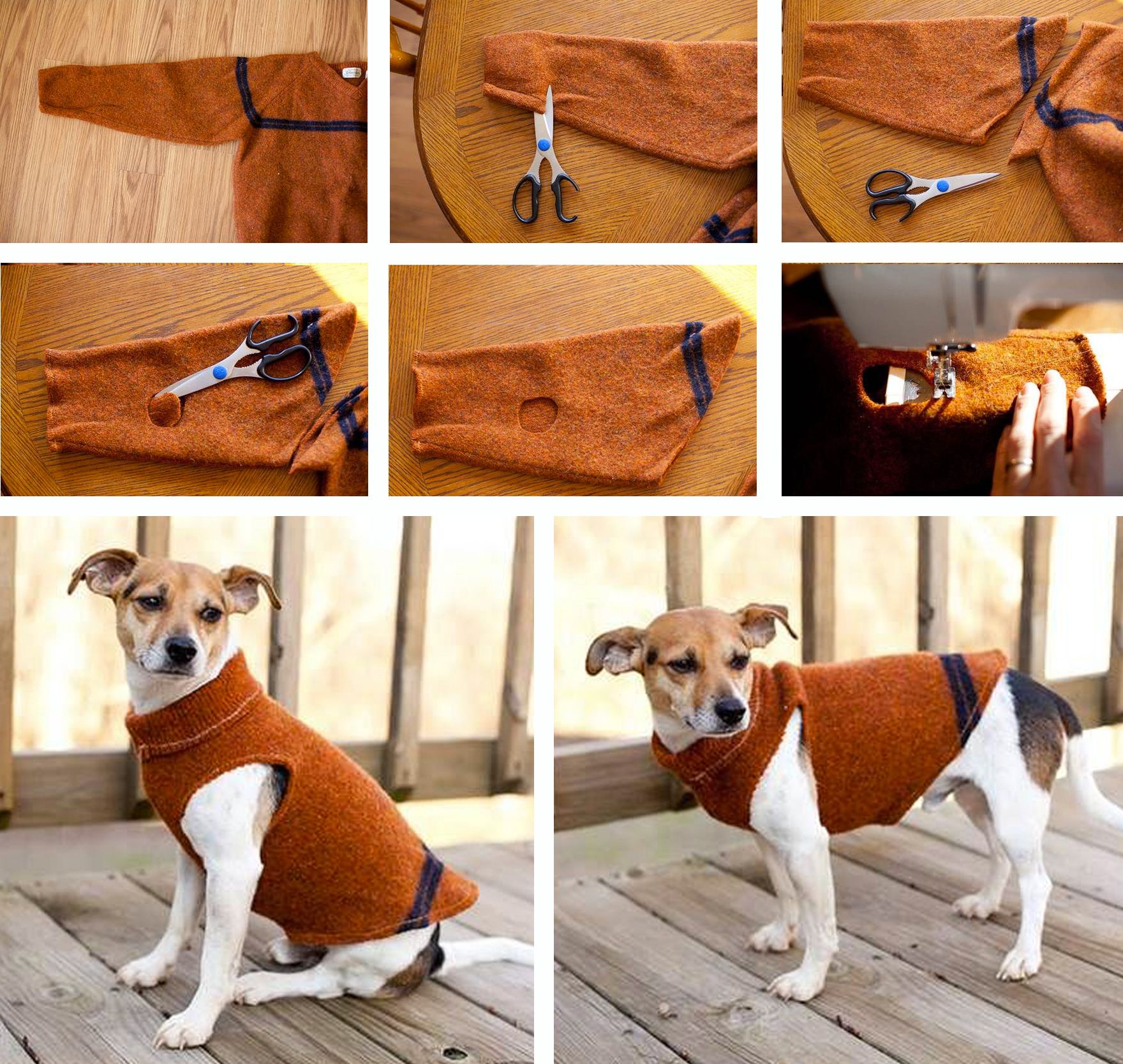 При минимальных навыках в шитье или вязании одежду для собаки можно изготовить собственноручно. Для первой попытки можно не тратиться на покупку материала, а использовать ненужную куртку, джинсы или другую надоевшую одежду.