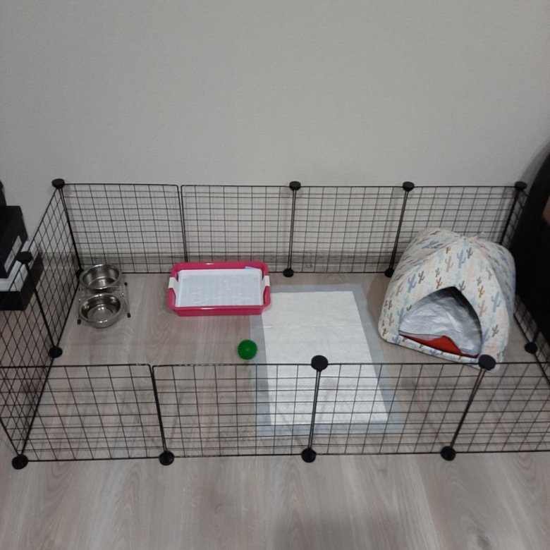 - Настелить на пол плотную плёнку или линолеум, разместить предметы для питомца, для мисок сделать крепления из проволоки.Вольер лучше разместить там, где меньше шума и внимания, чтобы питомец не беспокоился