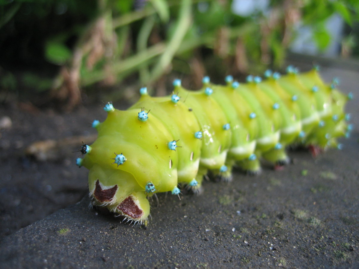 Гусеница около четырех дюймов в длину и почти 3/4 дюйма в диаметре. Цвет тела светло-зеленый с флуоресцентным синим оттенком. На верхней части тела сразу за головой несколько пар больших бугорков, похожих на красные, оранжевые или желтые шары, покрытые черными шипами. По остальной длине тела два ряда желтых шипов и два ряда светло-голубых шипов.