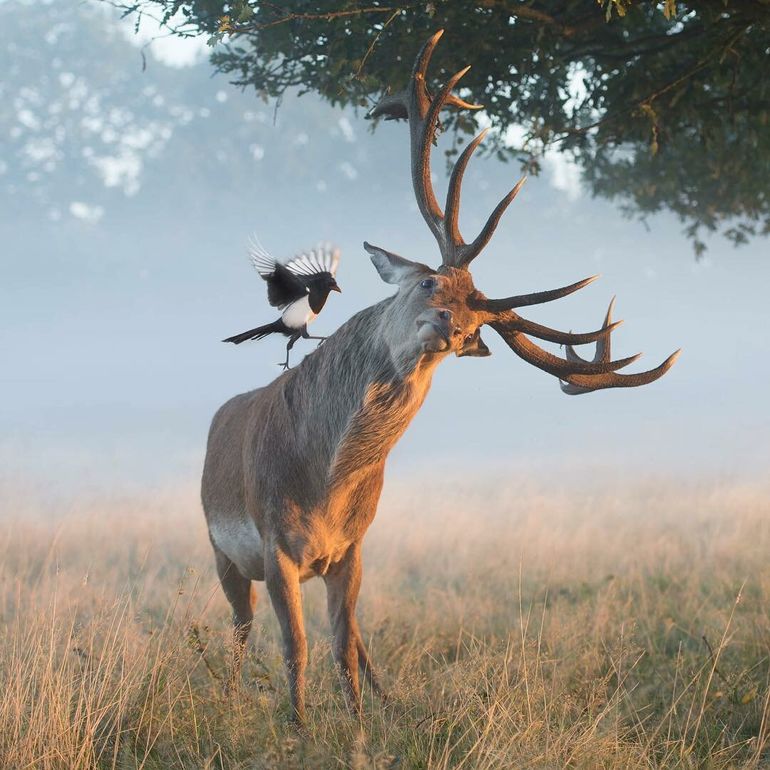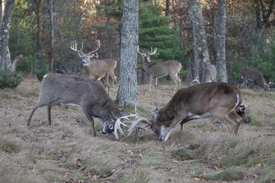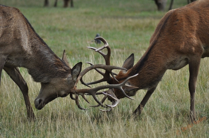 Этот же самец оленя защищает своих дам от посягания других конкурирующих самцов. В борьбе за самок самцы оленей устраивают самые настоящие почти что рыцарские поединки, сталкиваясь своими рогами.