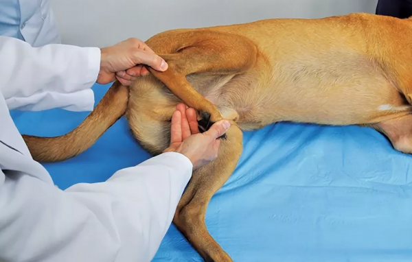 - Аккуратно слегка надавливать на краниальную поверхность бедра собаки, поглаживая при этом живот животного.