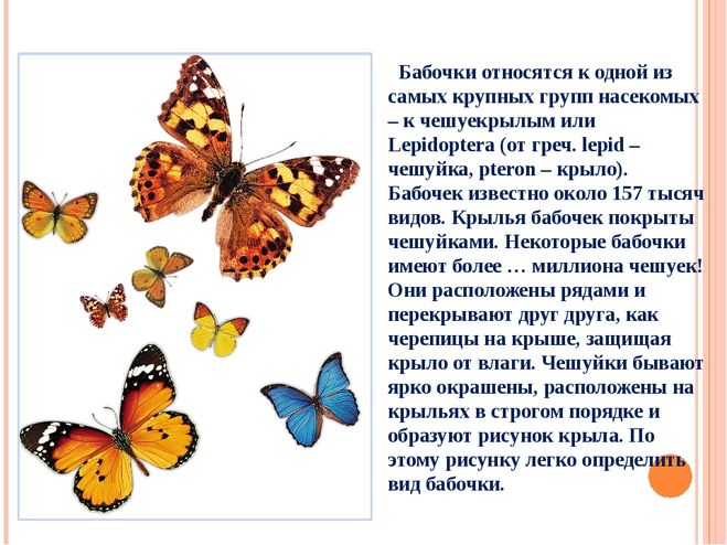 4.В настоящее время выделяют около 165 тысяч видов бабочек. Причём большинство из них предпочитает вести ночной образ жизни. Каждый год энтомологи открывают их неизвестные виды.
