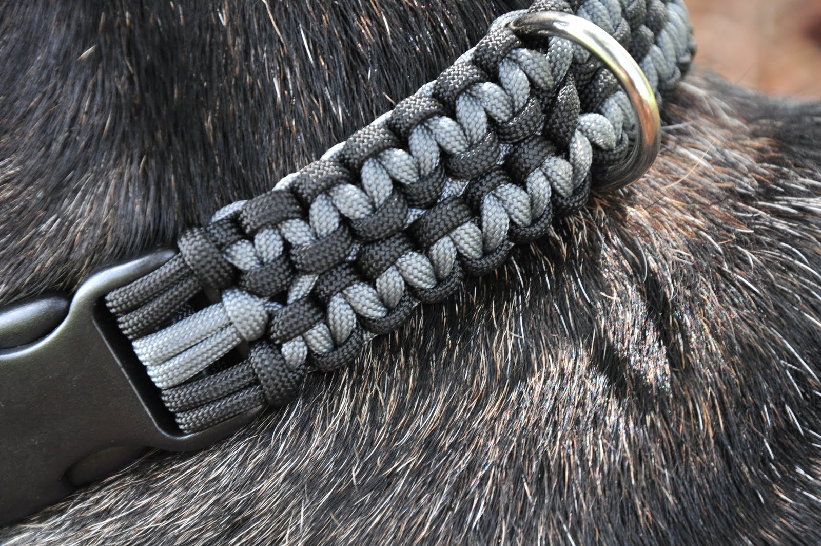 Сделать ошейник для собаки можно плетёным. Для этого пригодится паракордовый шнур. Плетут аксессуар по любой понравившейся схеме, не забыв предварительно закрепить застёжку.