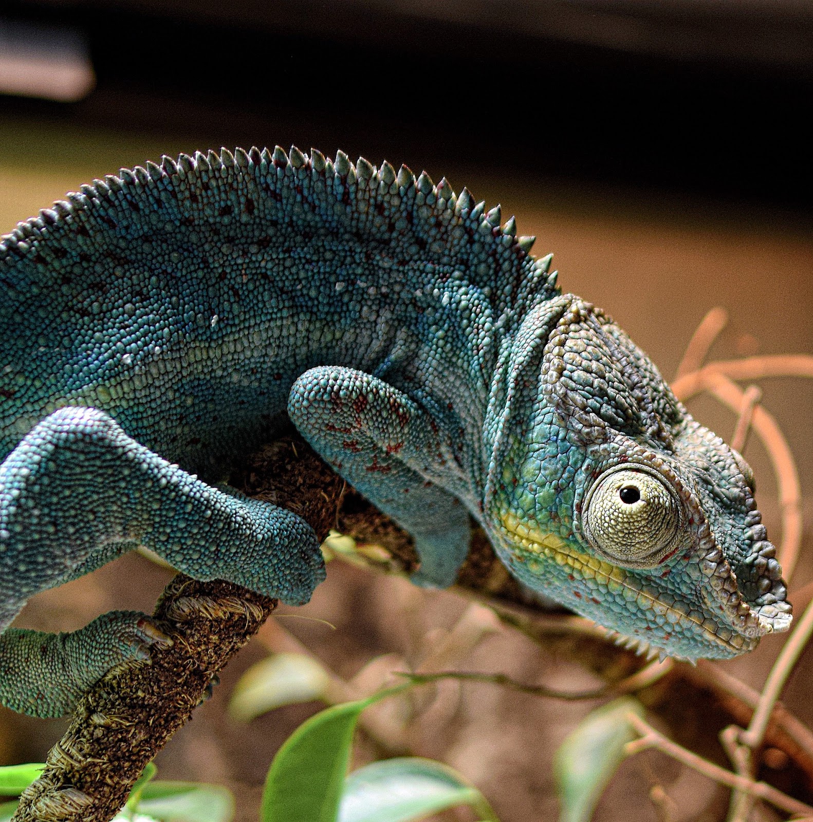 - Глаза прикрыты сросшимися веками с отверстием для зрачка. Они имеют уникальное строение и дают хамелеону круговой обзор пространства.