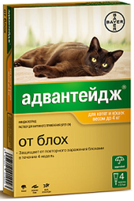 Адвантейдж, капли от блох на холку для кошек весом до 4 кг, 4 шт