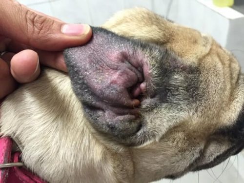 Воспаление ушей развивается на фоне атопического дерматита, пищевой или лекарственной аллергии. Для данной разновидности патологии характерно наличие эритемы (покраснение), папул, отека и повышенное сероотделение. Могут наблюдаться прозрачные выделения из слухового прохода. Часто сопровождается другими признаками в виде алопеции, высыпаний на коже с наружной стороны уха.