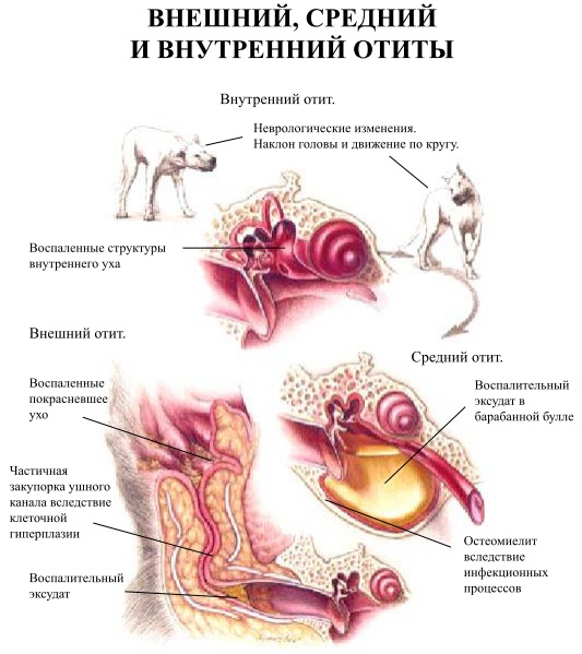 При поражении наружного слухового канала наблюдаются покраснение ушной раковины, отек, местное повышение температуры. При среднем и внутреннем отите собака часто испытывает боль при открывании пасти, трудности при жевании пищи, иногда имеются выделения из глаз.