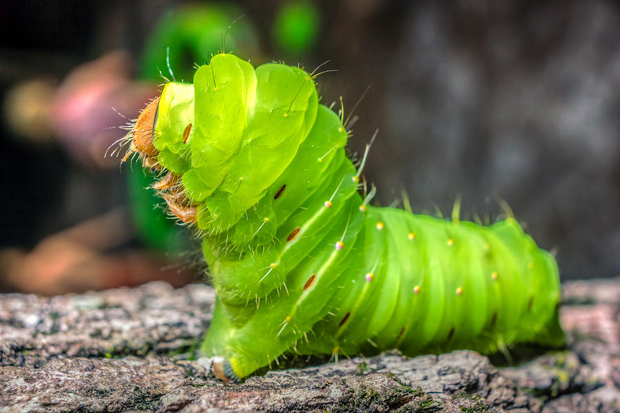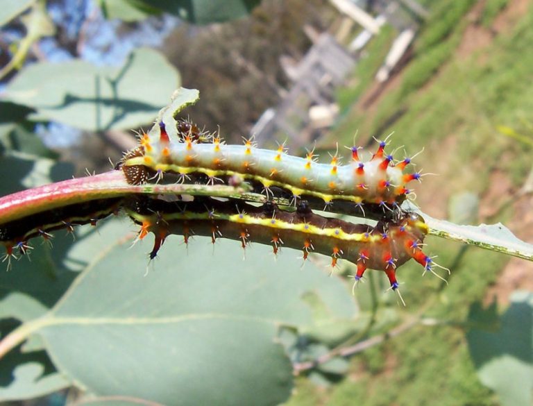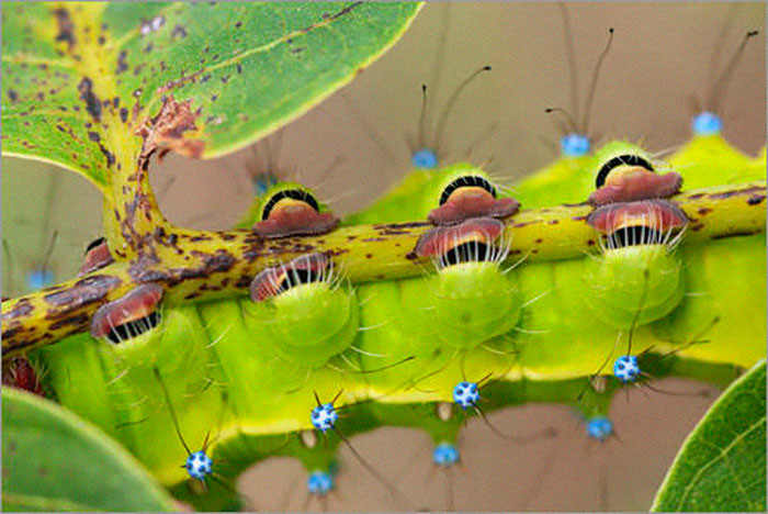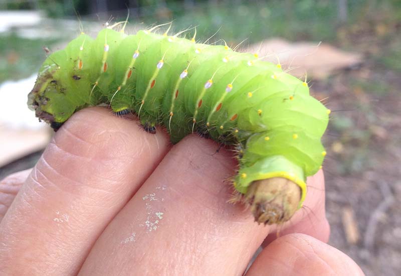 - Зеленая гусеница с разноцветными пупырышками – цекропия.