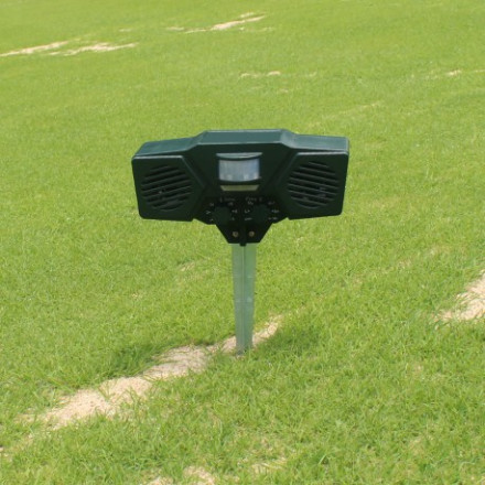 Этот ультразвуковой динамик предназначен для создания шума, отпугивающего обычных уличных животных. В нем не используются химические вещества, которые могут нанести вред домашним животным, детям или растениям. Он водонепроницаем, поэтому вам не нужно беспокоиться о том, чтобы принести его внутрь в дождливые дни, и он сделан из прочной твердой пластиковой конструкции, которая также выдерживает снег, лед и ветер. Закрепите его на земле с помощью прилагаемого шипа или повесьте на такие предметы, как деревья, заборы или стены. Он имеет угол 110° и эффективно работает на расстоянии около 30 футов.