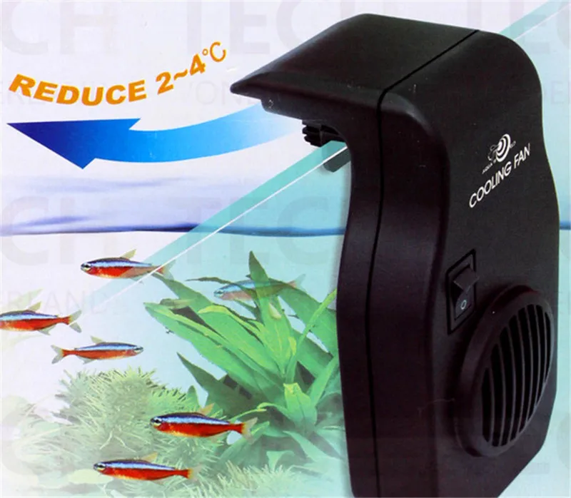 Большинство имеющихся в продаже охладителей представляют собой небольшие вентиляторы одинарного или двойного исполнения. Обычно работают при низком напряжении 12В. Охладители расположены на резервуаре таким образом, чтобы они могли обдувать поверхность воды. Это вызывает охлаждение за счет испарения. В большинстве случаев эта мера приведет к падению температуры от 1 до 4°C.
