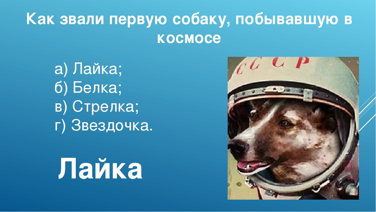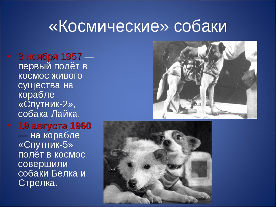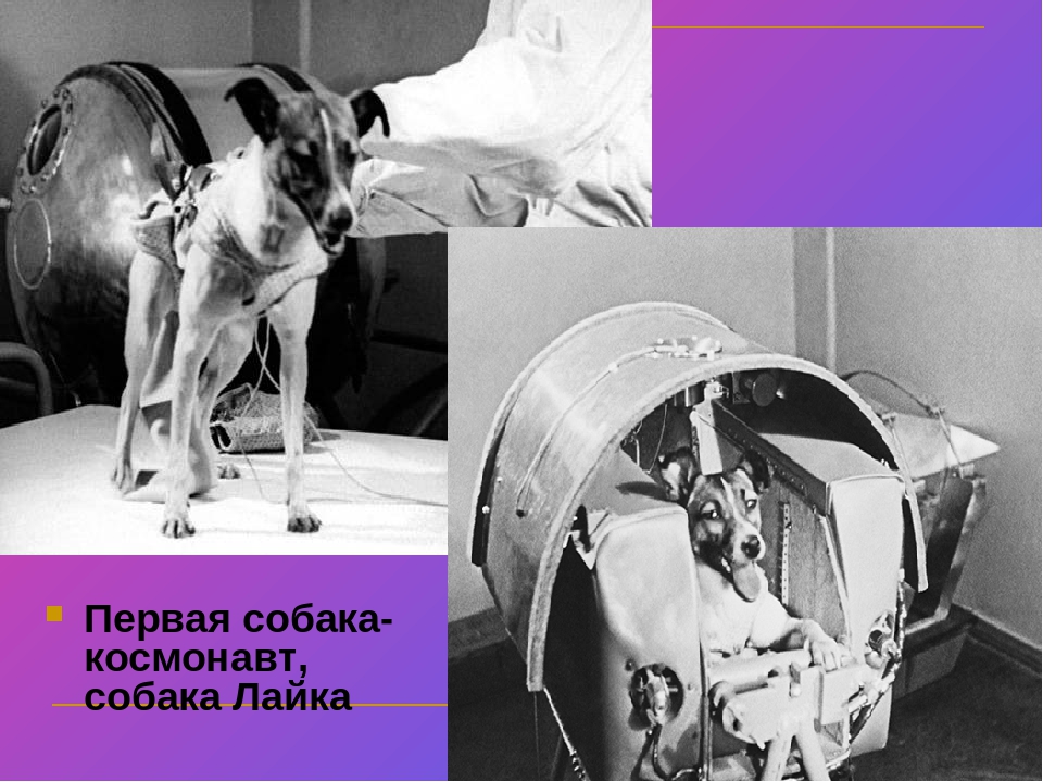 Лайка была первой собакой, отправленной на орбиту вокруг Земли (другие собаки были запущены ранее во время субжирных полетов).Она летела на Спутнике-2, российской миссии, которая стартовала 3 ноября 1957 года (Спутник-2 представлял собой металлическую сферу, которая весила около 250 фунтов = 113 кг). Первоначально считалось, что Лайка прожила на околоземной орбите четыре дня и умерла в космосе, когда аккумуляторы в кабине перегрелись.