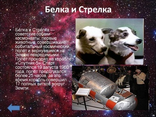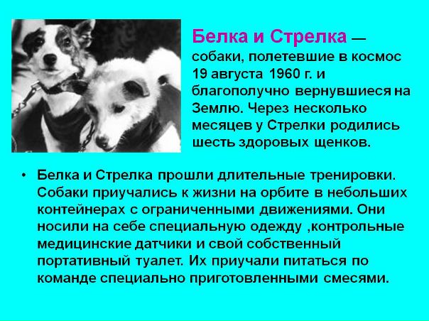 Лисичка была любимицей Сергея Королева, и он перед стартом сказал ей: «Я очень хочу, чтобы ты вернулась». На 38-й секунде полета корабль взорвался. - 19 августа 1960 года собаки Белка и Стрелка стали первыми живыми существами, облетевшими вокруг Земли (также на «Востоке»). Спустя некоторое время Стрелка родила шесть здоровых щенков. Одну из ее дочек по кличке Пушинка Хрущев подарил президенту США Джону Кеннеди. Белка и Стрелка прожили по собачьим меркам долгую жизнь, а затем из них набили чучела, хранящиеся в Музее космонавтики.