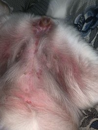 Зачастую сыпь появляется на животе, на морде и возле анального отверстия.
