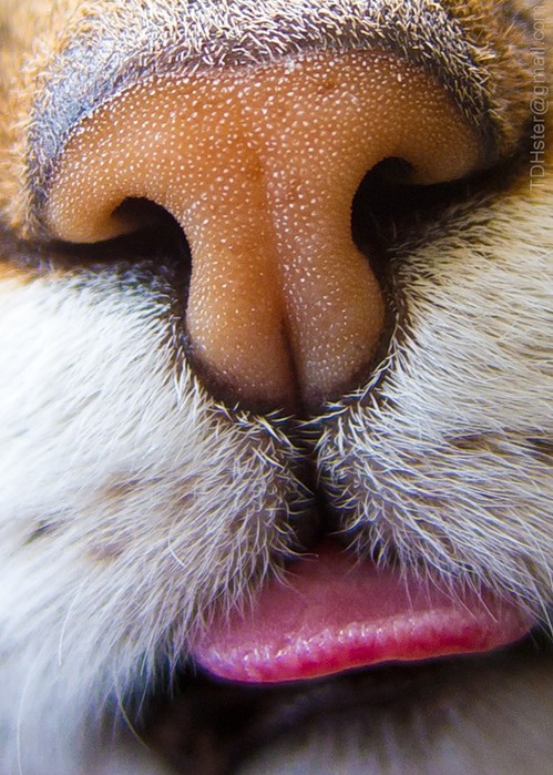 Воздух попадает в ноздри кошки через лобные, круглые части носа. Когда кошка выдыхает, воздух выходит через прорези в нижней части носа.